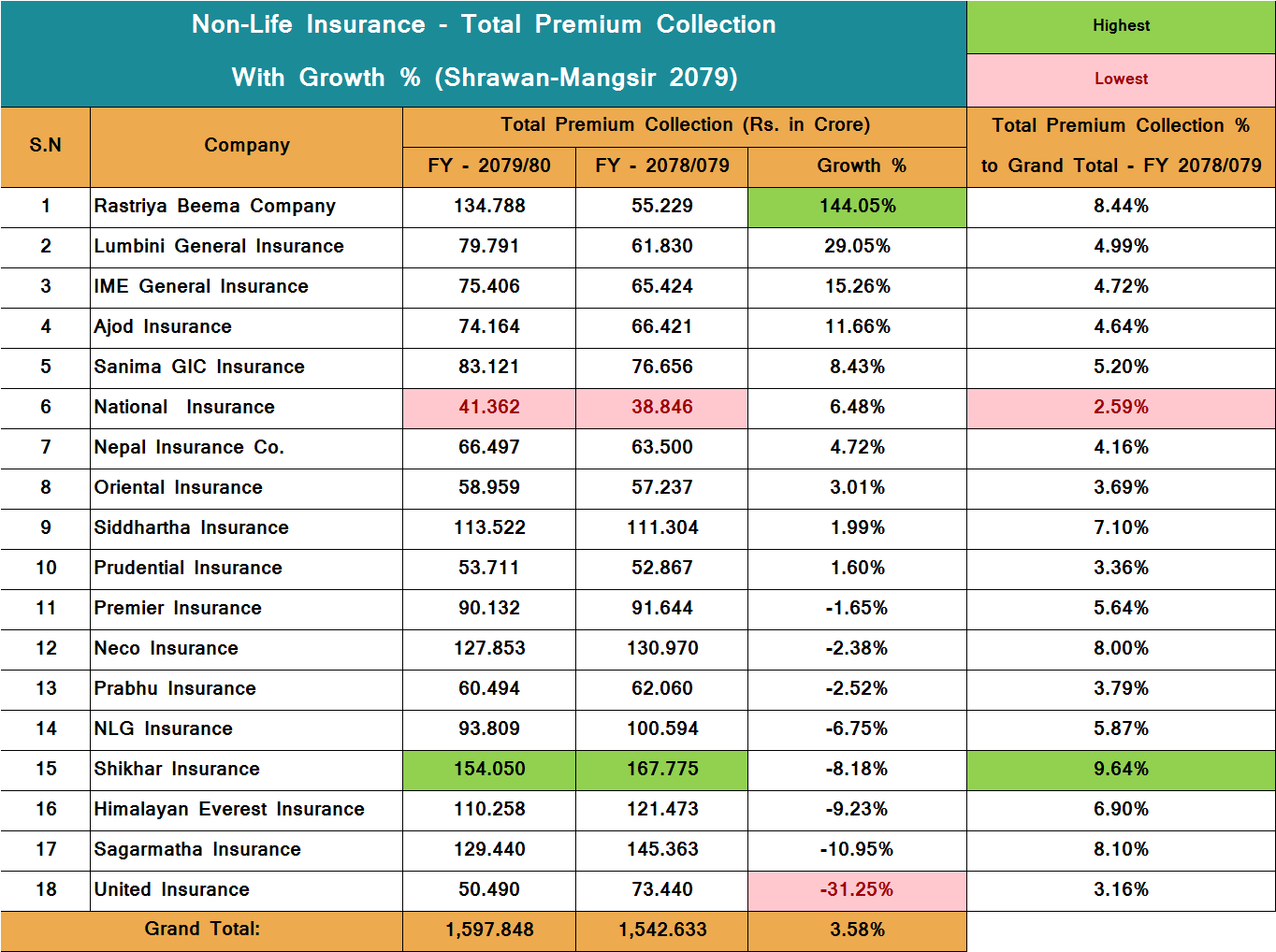 Rastriya Beema Company comes second with Rs 1.34 billion in premium collection followed by Sagarmatha Insurance with Rs 1.29 billion and Neco Insurance with Rs 1.27 billion in premium collection.