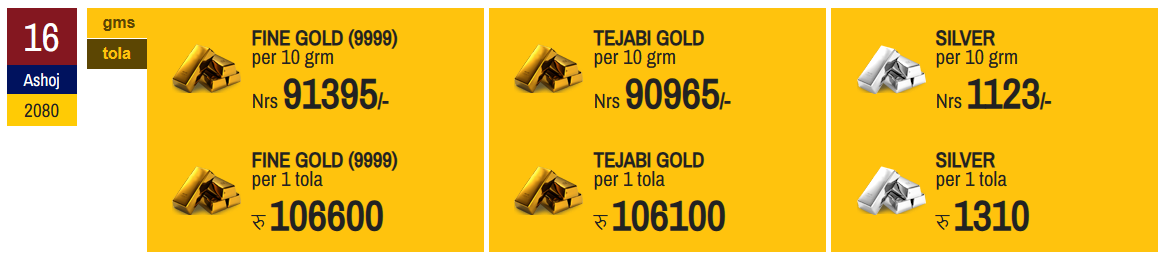 According to the Federation of Nepal Gold and Silver Dealers’ Association, the price of fine gold is Rs 106,600 per tola and tejabi gold is Rs 106,100 per tola today.