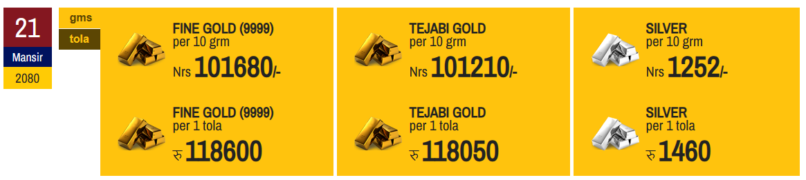 According to the Federation of Nepal Gold and Silver Dealers’ Association, the price of fine gold is Rs 118,600 per tola and tejabi gold is Rs 118,050 per tola.