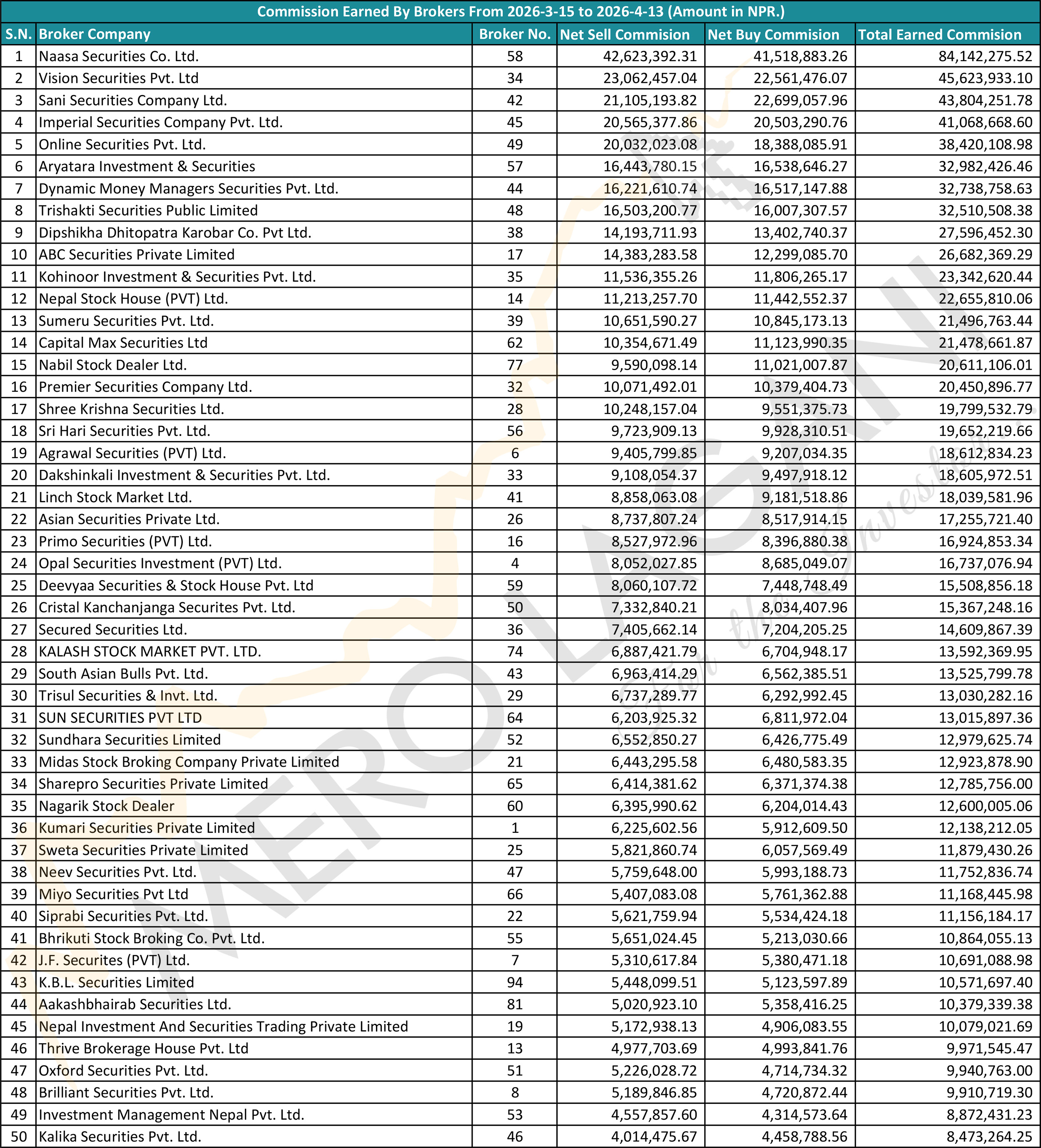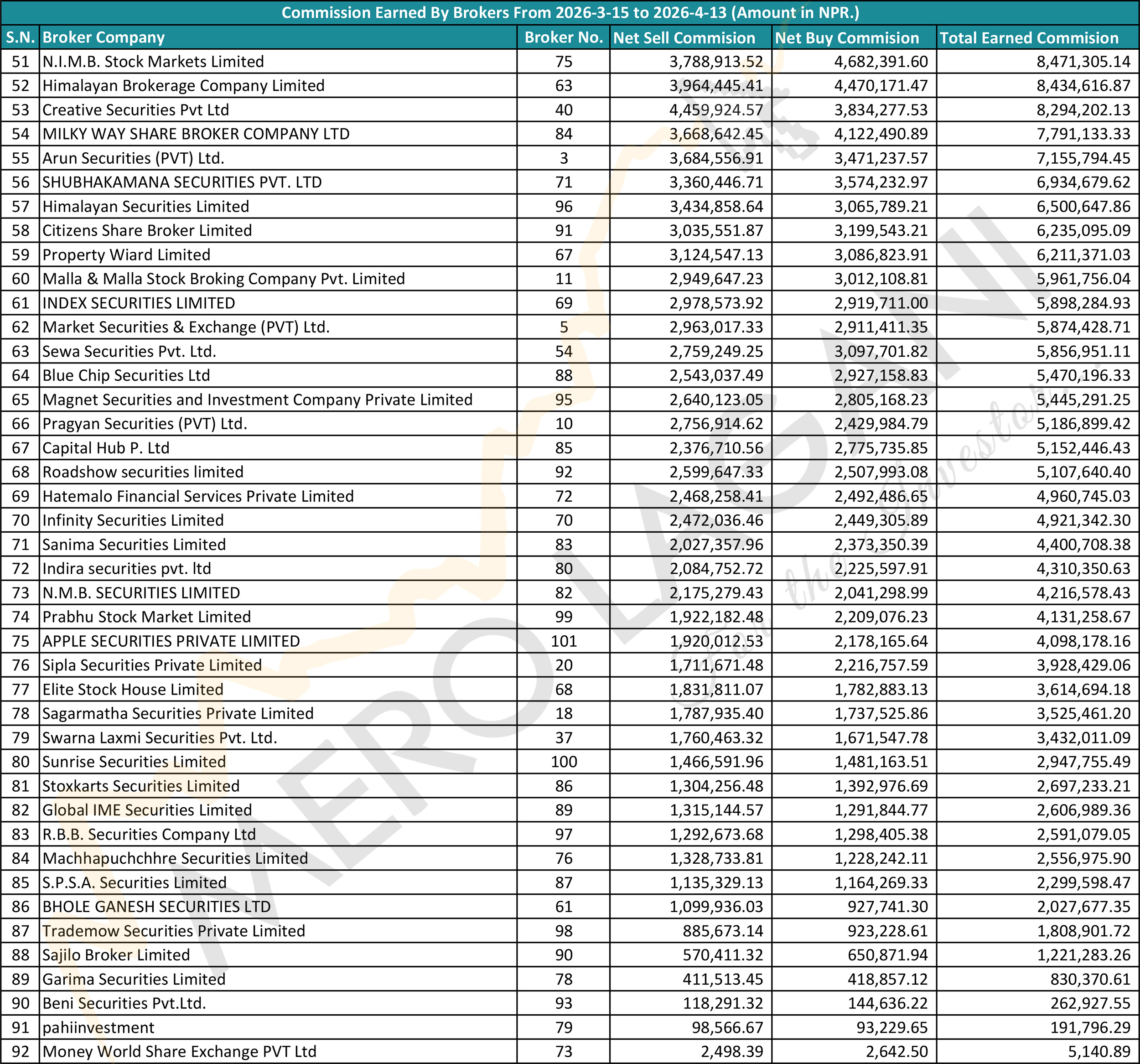 नेपाल स्टक एक्सचेन्ज (नेप्से)ले सार्वजनिक गरेको चैत महिनाको तथ्याङ्क अनुसार, बजारका ९२ वटा ब्रोकर कम्पनीहरूले कुल ९२ करोड ४२ लाख २ हजार ५०४ रुपैयाँ कमिसन आर्जन गरेका छन्।